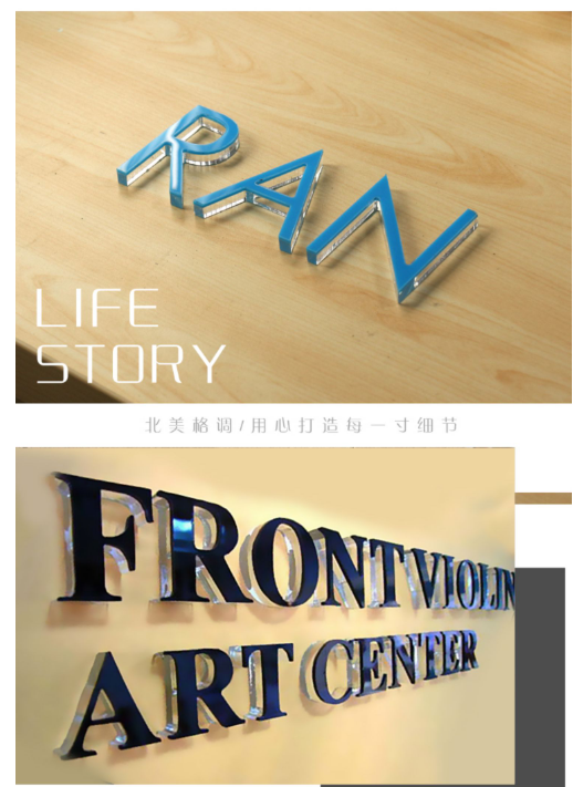 2.不銹鋼板烤漆:根據字形切割出對應的不銹鋼板,然后烤漆上色,最后粘貼在水晶字表面
