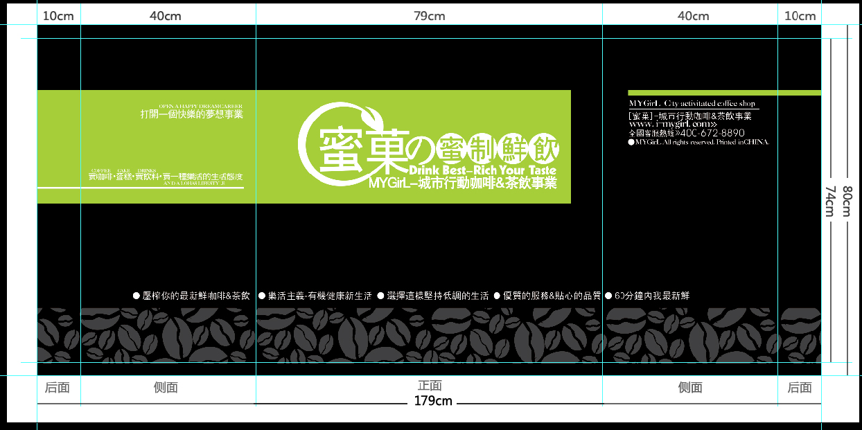 面板尺寸為:179x80cm  其中面板的設計安排為(10+40+79+40+10)x80cm (上下3cm不要有文字,會被包住的)